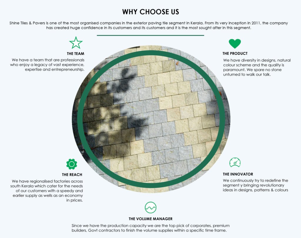 Shine Tiles & Pavers Pvt Ltd is a Company engaged in the manufacture and marketing of Cement Concrete Pavers and Tiles marketed under the brand name “Shine Tiles & Pavers” based at Thiruvananthapuram, Kerala. YShine Tiles & Pavers is a team of marketing and manufacturing professionals joined together to fulfil their dreams to deliver the best possible flooring solutions to your interior and exterior requirements.
